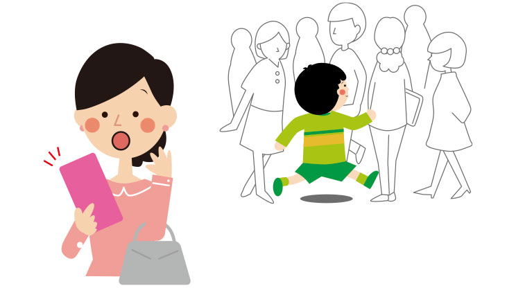 子どもと一緒に出掛ける時も「みもり」は活躍します。迷子防止機能を「オン」にすると、子どもと保護者が一定以上(10m前後)離れたとき、保護者のスマートフォンにプッシュ通知でお知らせします。