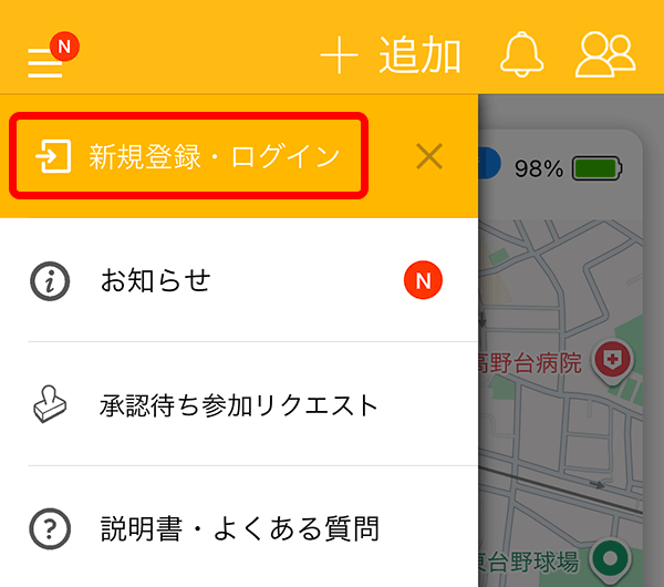 みもりアプリを開き、アプリトップの左上メニューをタップし「新規登録・ログイン」 をタップします。
